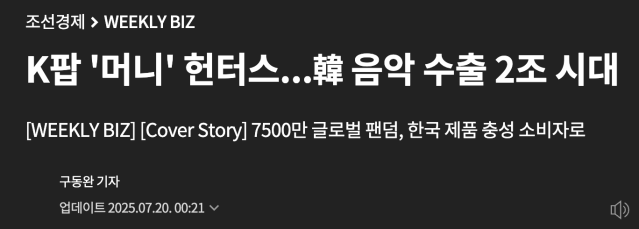 “K팝 ‘머니’ 헌터스…韓 음악 수출 2조 시대” (K-Pop ‘Money’ Hunters…Korean Music in its 2 Trillion Era), Chosun Ilbo, 7/20/25 (English version)